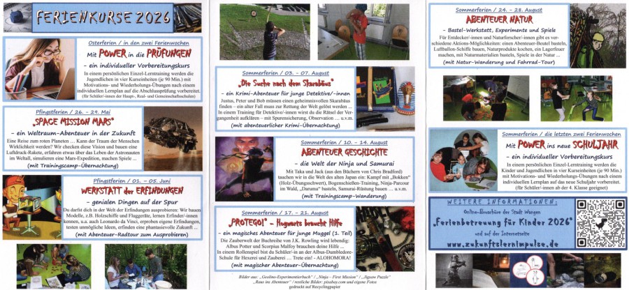 Die Ferienkurse für Schüler ab der 4. Klasse sollen den Kindern und Jugendlichen die Möglichkeit geben, bei verschiedenen thematischen Aktionen (z.B. "Bücherwelten", "Erfinder-Werkstatt", "Detektiv-Training", "Abenteuer Geschichte", "Theater-Werkstatt" ...) spannende und interessante Ferientage zu erleben.